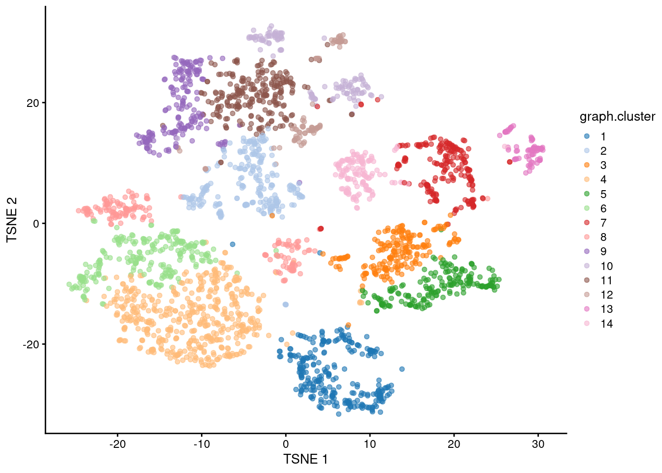 plotReducedDim(res.zeisel$x, "TSNE", colour_by="graph.cluster")